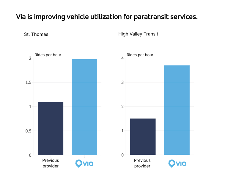 - After: Via's modern software continuously optimizes driver schedules based on same-day trip adjustments and real-time traffic conditions, minimizing manual interventions. By commingling, HVT raised the efficiency of the combined service by over 150%. Similarly, St. Thomas upgraded to a tech-enabled paratransit system and gained an immediate utilization rise of 82%.