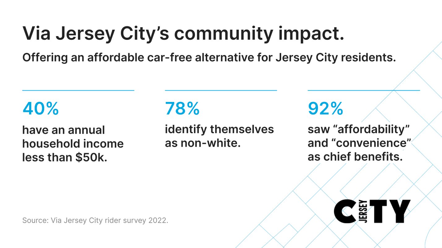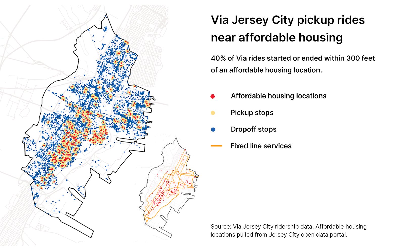 Together, affordable transit and affordable housing proved a powerful combination. After two years of service, data also shows that 40% of all Via Jersey City rides started or ended within 300 feet of an affordable housing location – suggesting that low-income and diverse communities have benefited greatly from the innovative microtransit program. Rider survey results support that conclusion as well: