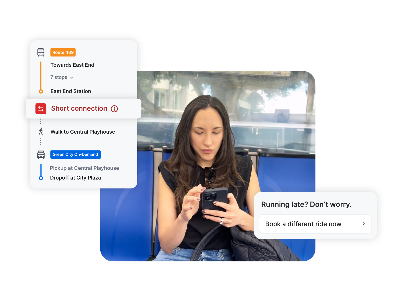 We can’t control when the bus is late, but we can help riders stay on track if it happens. The Via App warns riders about short intermodal connections before they book. And if a delay means a missed bus ride, the App shows riders alternate departure times so they can still get where they need to go.