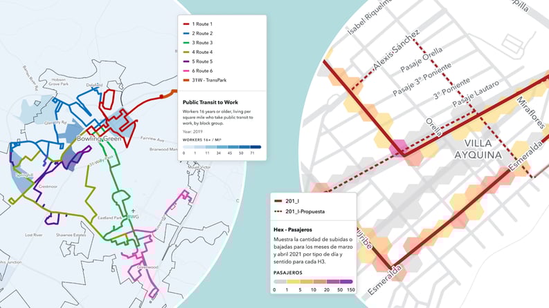 Bowling Green, Kentucky (left) identifies areas with high potential for transit use and Calama, Chile (right) uses passenger count data to make informed decisions on a route redesign.