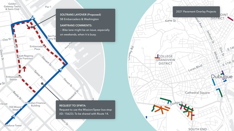Agencies like SamTrans (San Mateo, CA) use Presentation Studio along with Remix’s text annotations to collaborate with other regional transit agencies. Transportation plans are complex, making them difficult to explain and contextualize with just an email or phone call. Remix maps provide all the visual context so that stakeholders in other agencies understand your proposals clearly.