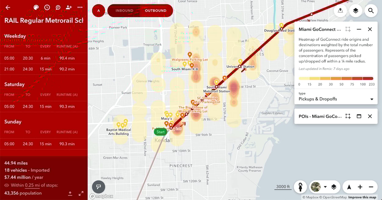 With the new, Via-powered GoConnect service, the County provides shared, first-and-last mile rides to and from Metrorail Stations. The on-demand service is fully integrated with the County’s fixed route network. Remix offers the County a holistic platform with transit planning, street design, and mobility management, that has enabled them to gain process efficiencies, save staff time, and ensure accurate design concepts.