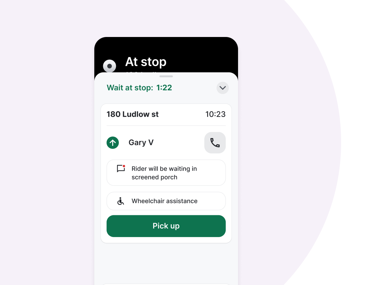 The Driver App displays relevant passenger information at pickup — like rider notes, payment method, and accommodations — so drivers can provide personalized service to every rider.