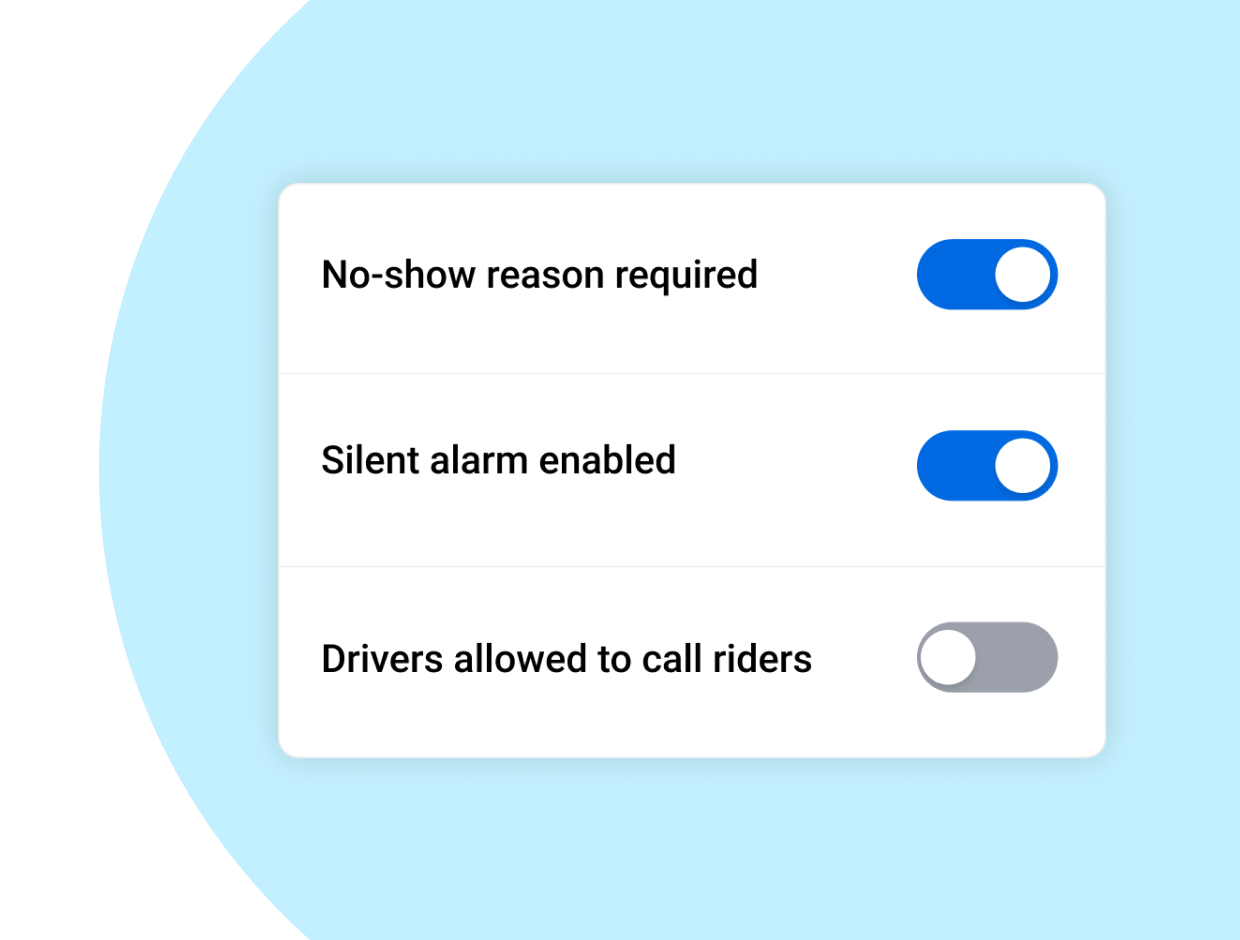 The Via Driver App can be tailored to reflect your procedures. For example, allow drivers to call riders from a masked number, require a reason for a no-show, give drivers permission to end their own breaks — or not! It’s your call.
