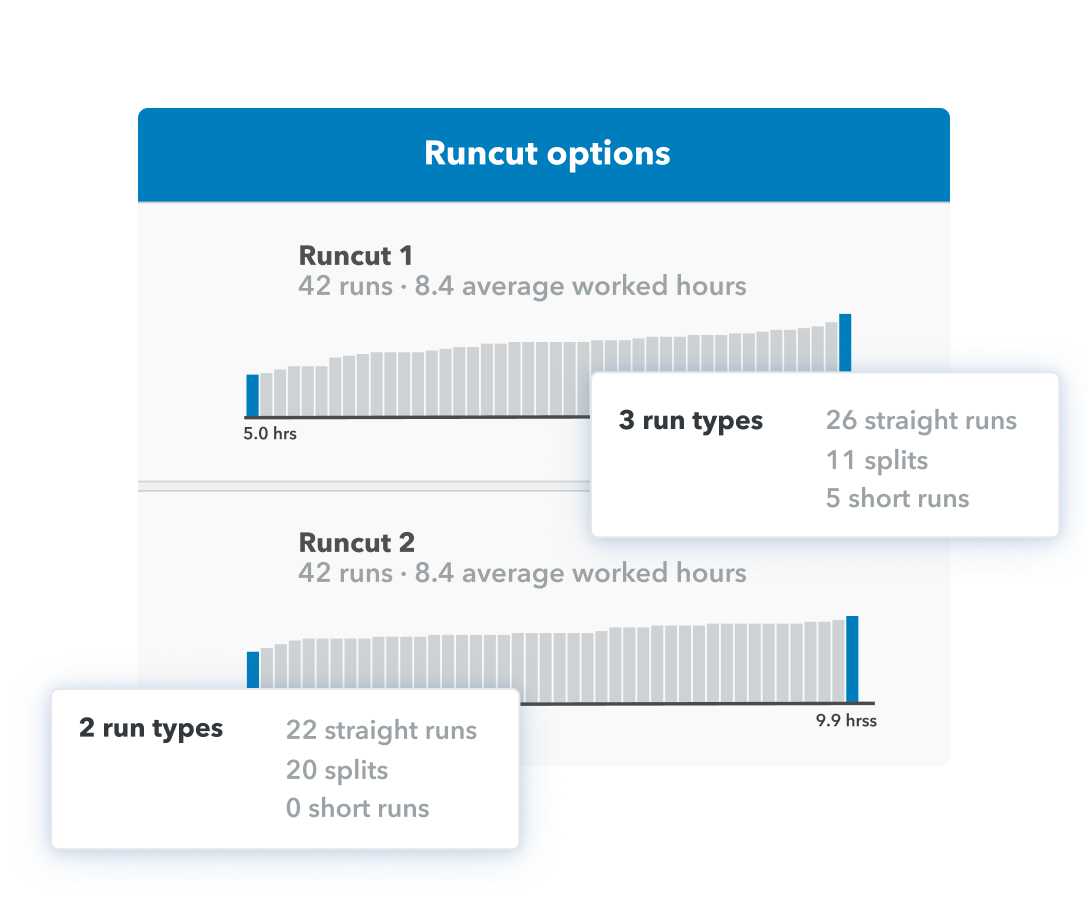 Assess multiple runcut options at once and visualize the answers to “How much?” “How fast?” and “How often?”. Remix’s algorithm considers your agency’s preferences and parameters to suggest multiple optimizations. Easily understand tradeoffs, make confident decisions, and move on.