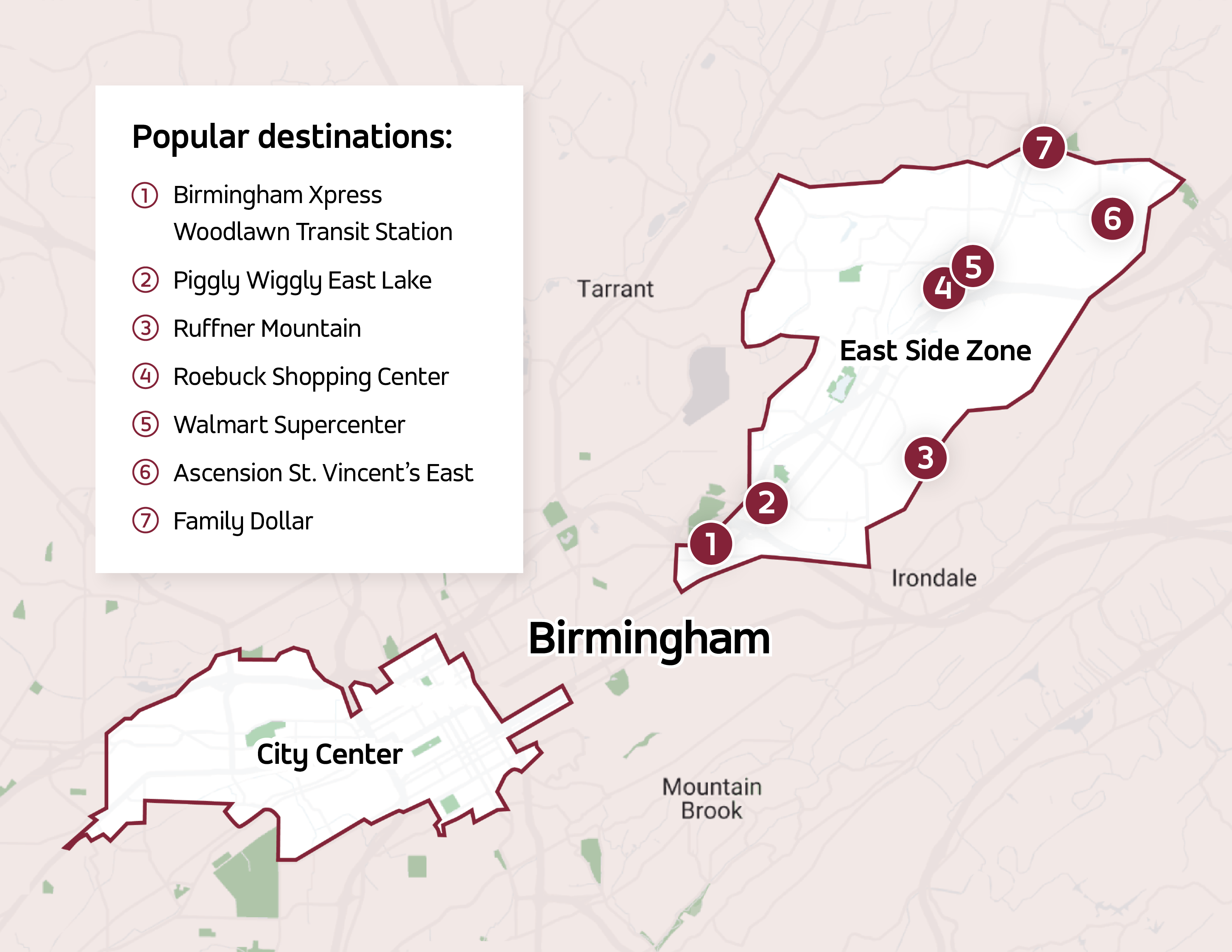 Birmingham On-Demand is a flexible public transit service that has served more than 130,000 riders in the original downtown zone since its launch in February 2019. As a result of its success, the City is launching a new East Side zone, which now serves the following neighborhoods: Huffman, Roebuck, Roebuck Springs, South Roebuck, Zion City, North East Lake, South East Lake, Wahouma, Woodlawn, South Woodlawn, Gate City, Airport Highlands, Brownsville Heights, Pine Knoll Vista, Echo Highlands, Penfield Park, Maple Grove, Killough Springs, and Spring Lake. The original downtown zone will continue operating as usual.