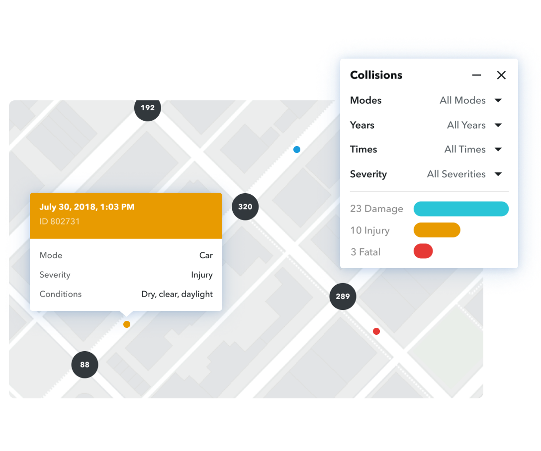 Incorporate relevant data around safety, curb inventory, existing and proposed bicycle networks, transit routes, origin-destination, movement counts, and more — so you can practice data-driven design in real-time.