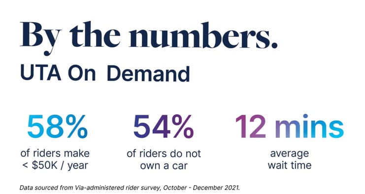 With ~20% of riders reporting that they have a disability, UTA On Demand is a key service for residents who face barriers to accessing the city’s resources. As one rider described, “I depend on UTA On Demand to get to work and school. It’s essential to my ability to function in my community with my disability.”