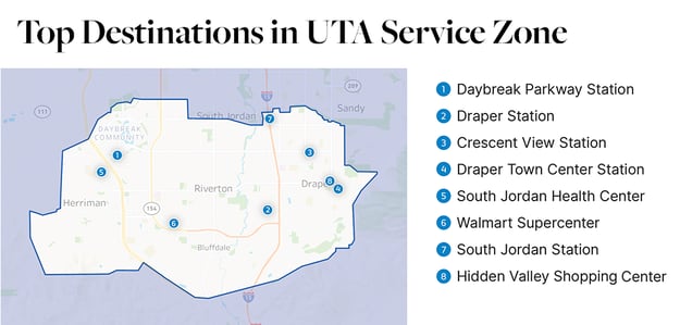 With 80% of riders reporting that they used UTA On Demand to commute to work or connect to public transit, it is little surprise that the most common destinations in the southern Salt Lake County zone are transit stops such as the Daybreak Parkway and Draper Town Center TRAX stations, as well as the Draper FrontRunner station.